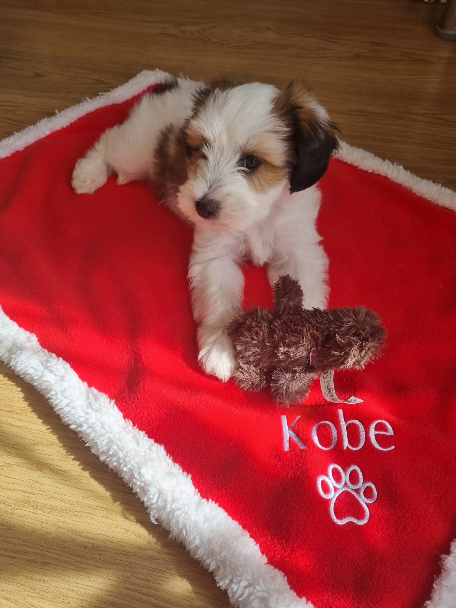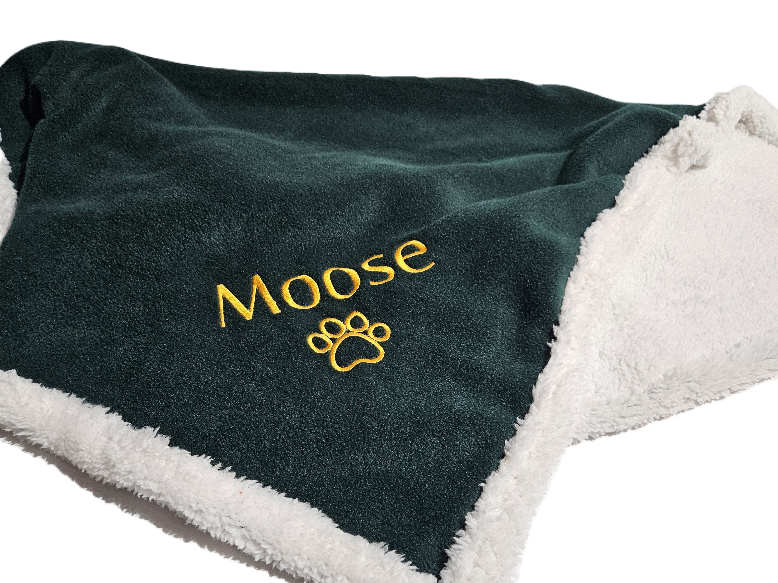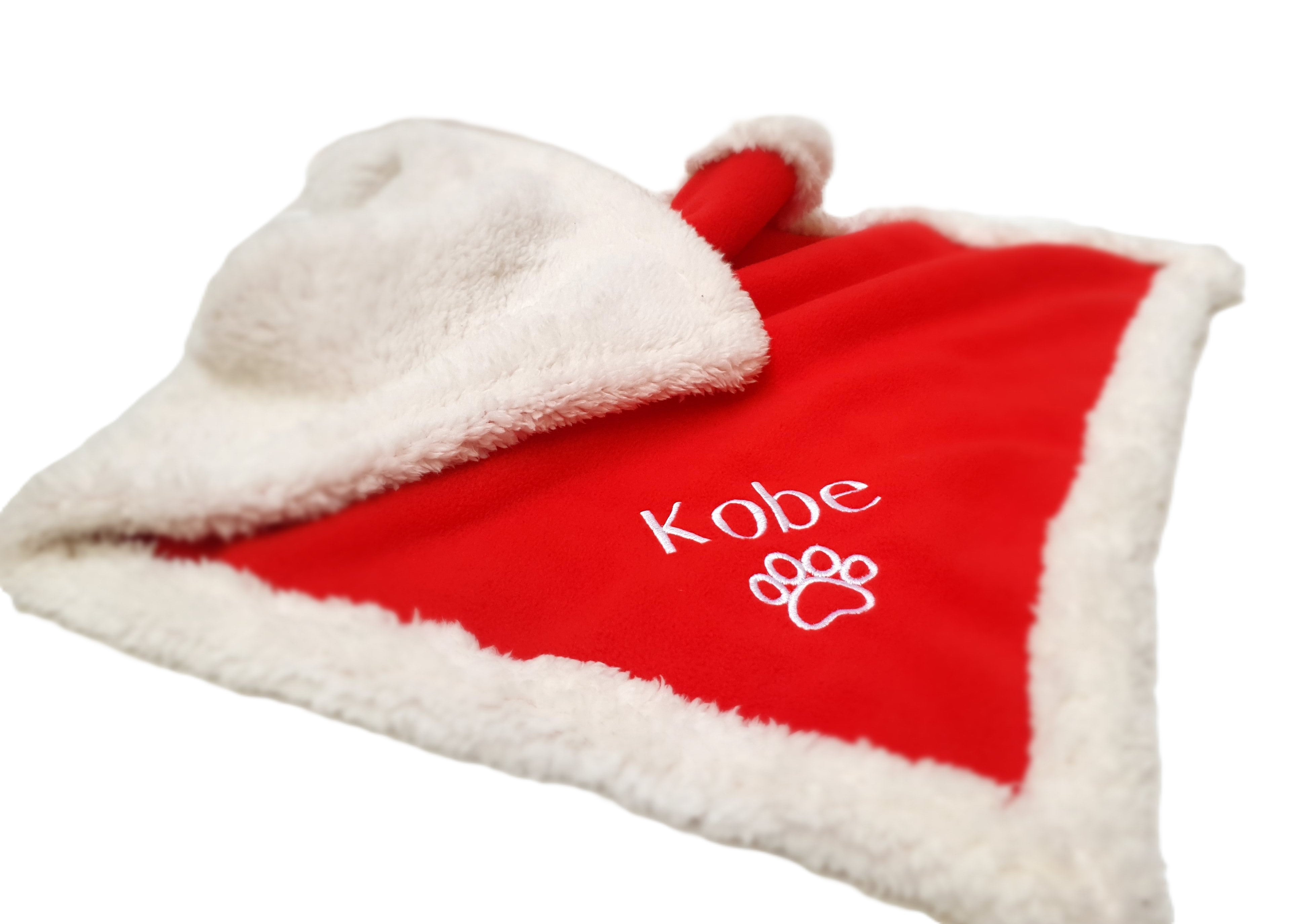 A supersoft Christmassy cosy blanket personalised with your dog's name, with white fluffy sherpa fleece on one side and either a red or bottle green warm polar fleece on the other.