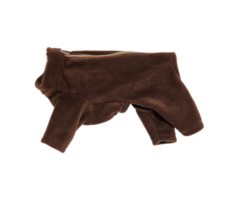 A 4 legged warm water-resistant dog jumper made from polar fleece, with a full length beige zip along the back. It can be worn outside to protect your dog from the elements, or in the house as a cosy jumper.