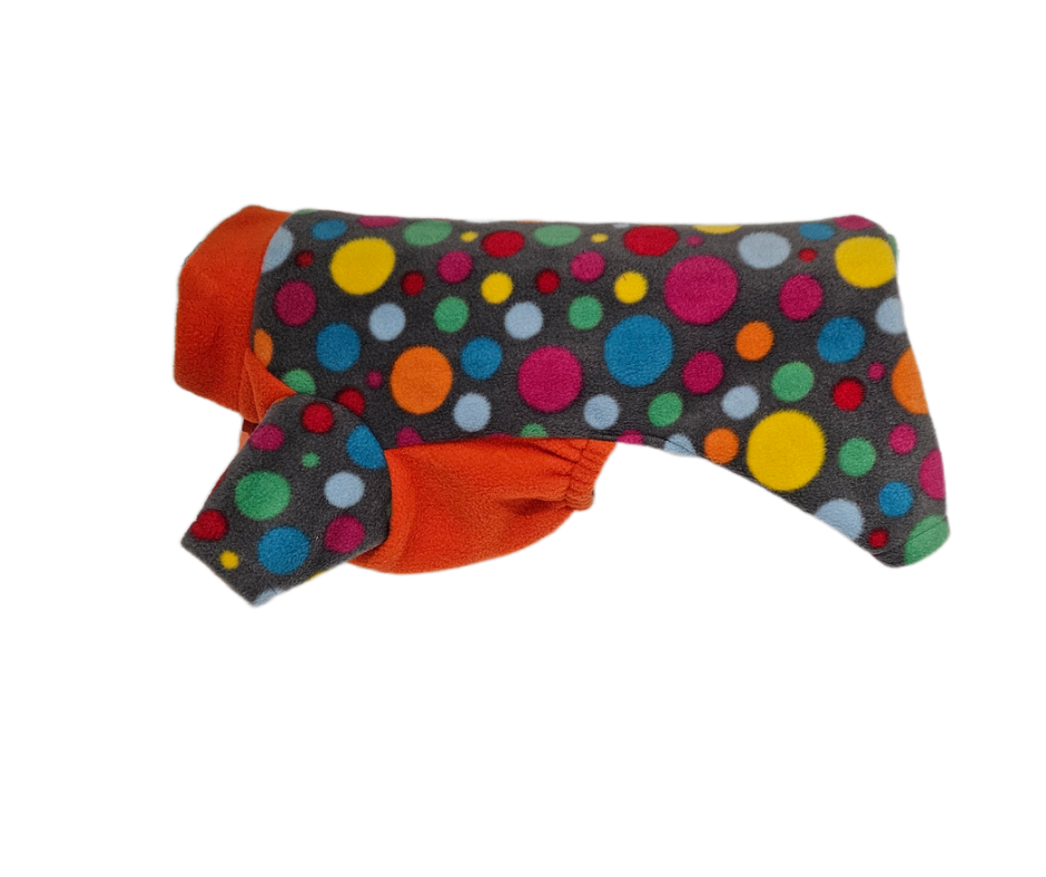 A 4 legged warm water-resistant dog jumper made from polar fleece. It can be worn outside to protect your dog from the elements, or in the house as a cosy jumper.