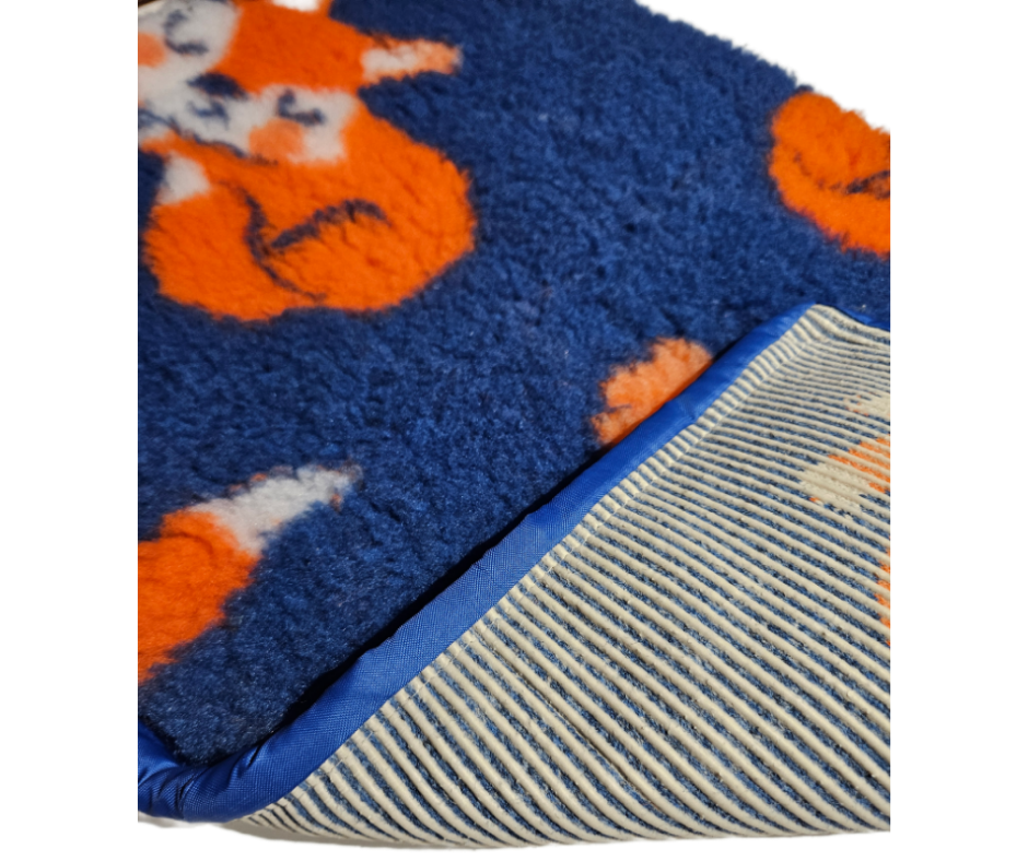 A cosy soft deep pile fleece mat made from vet bed fleece with a sewn bound edge for a neat finish. The mat has a non slip rubber backing and can be machine washed at up to 30 degrees.