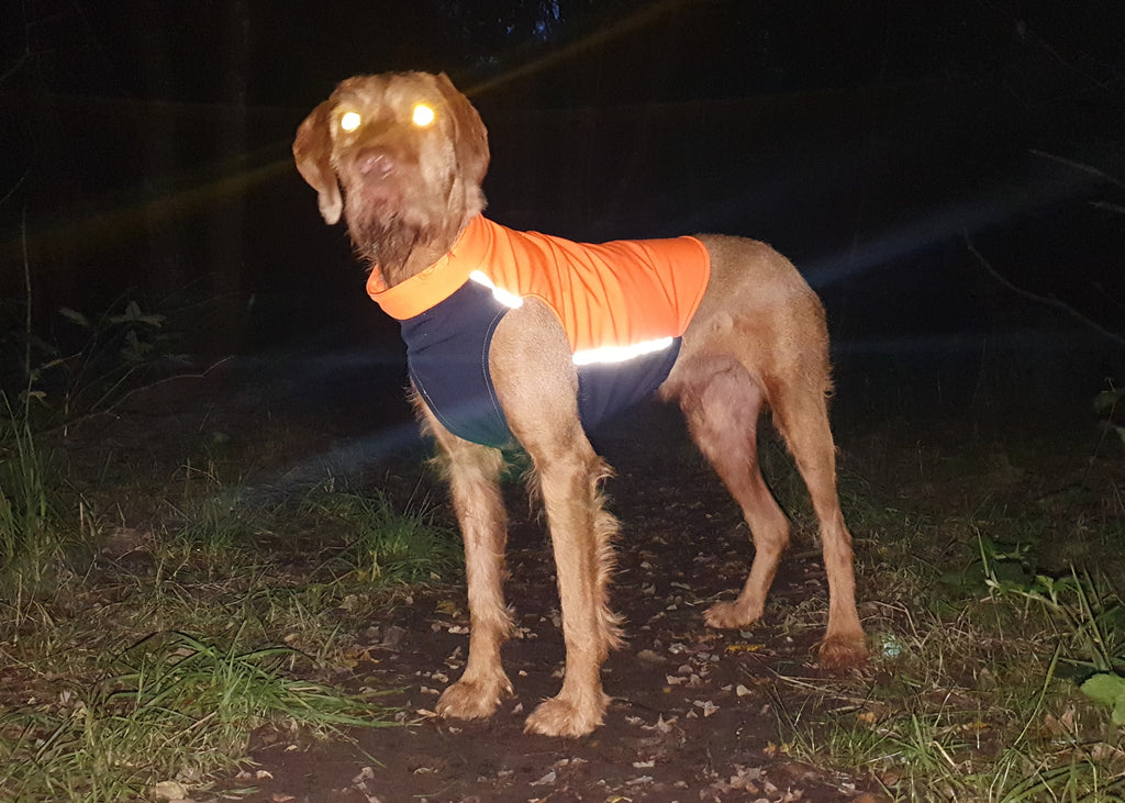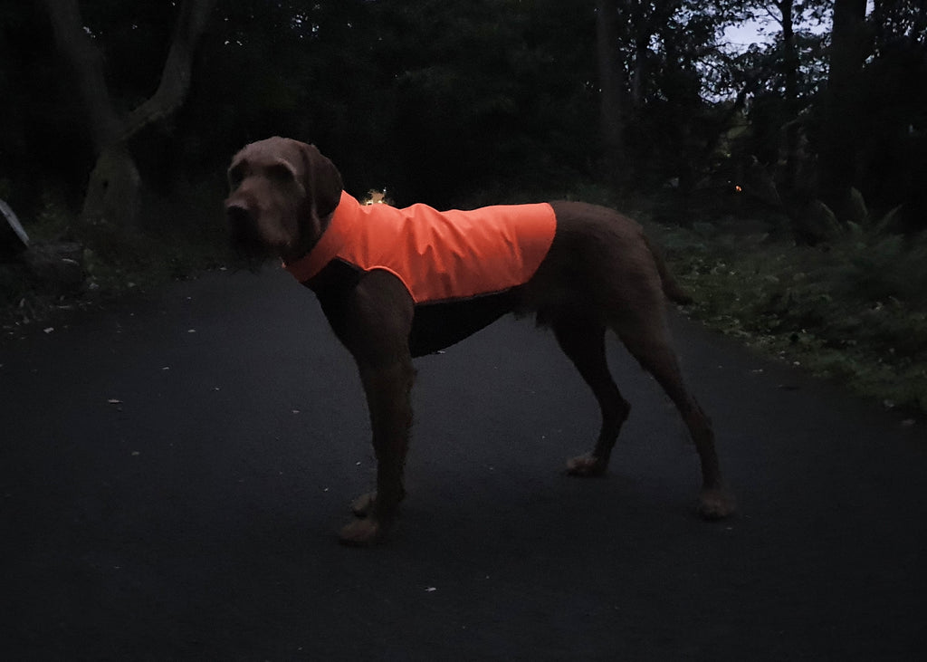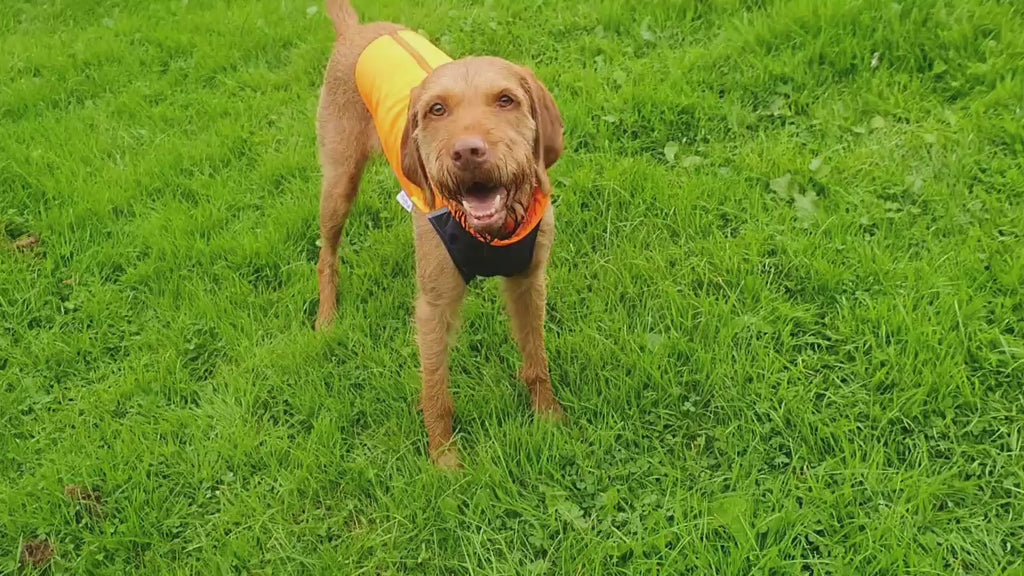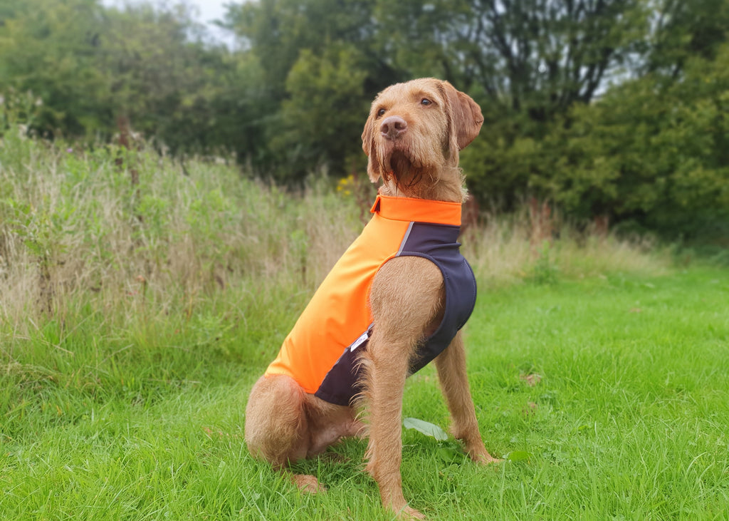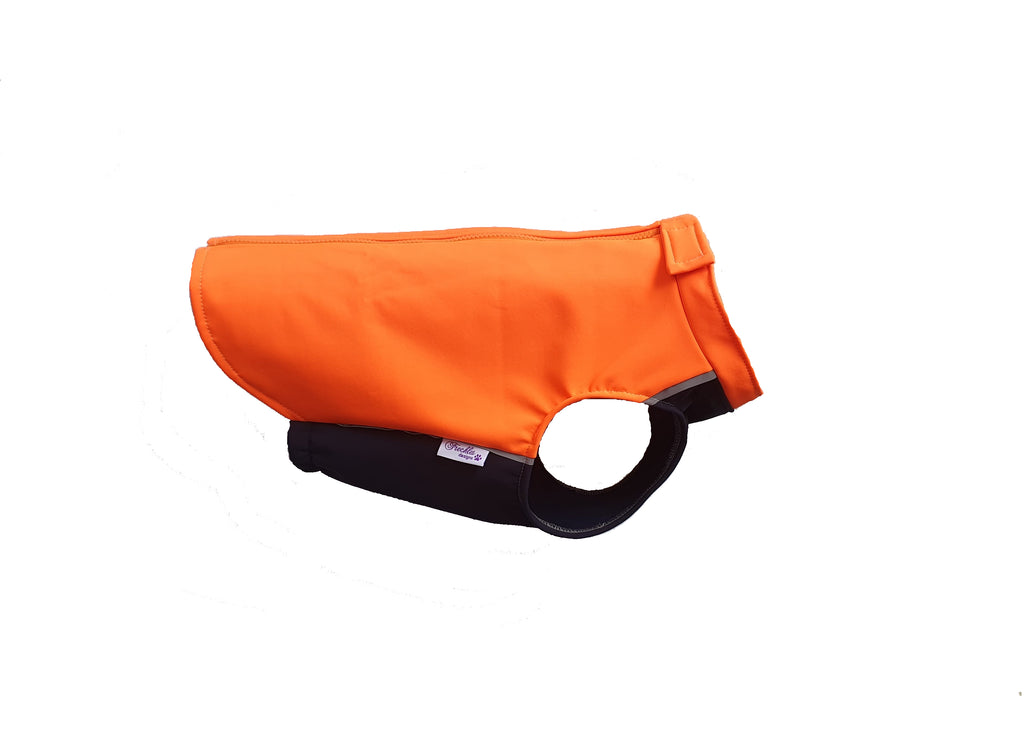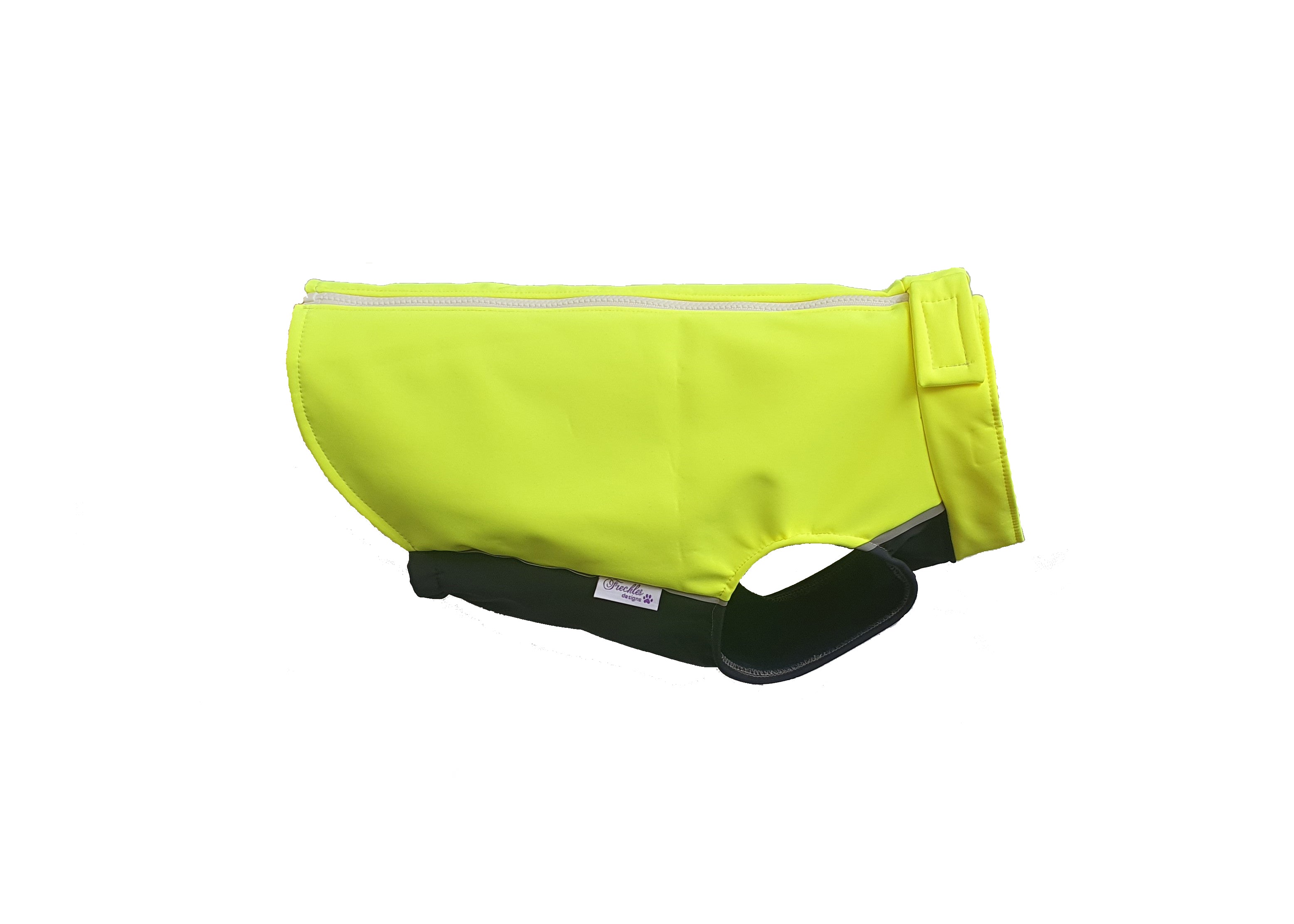 A high visibility dog vest made from softshell which is warm, breathable and water resistant.