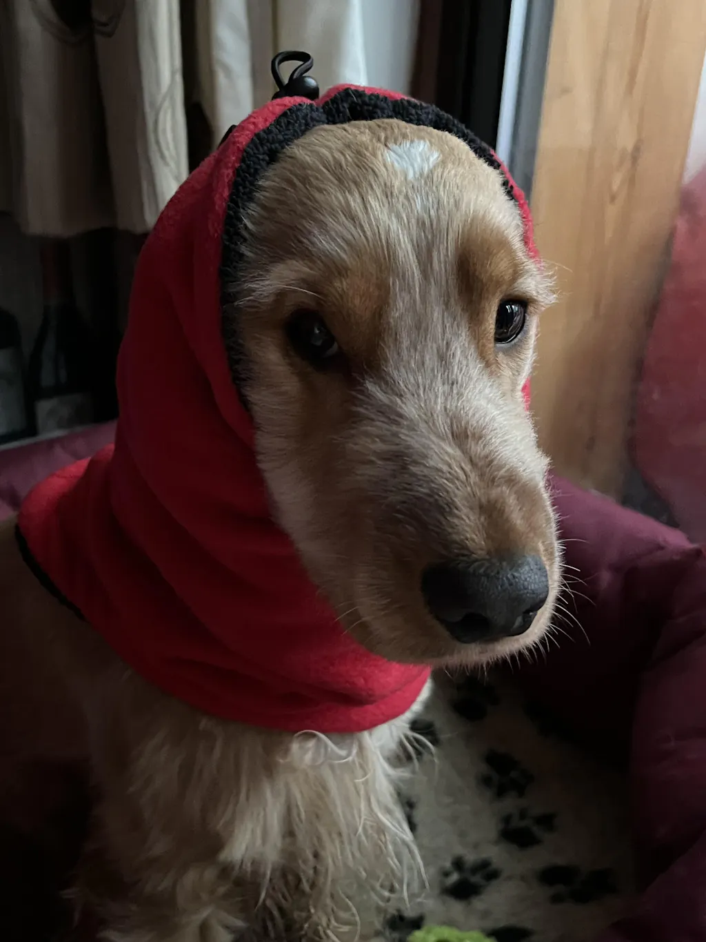The top of the snood is shaped to come over the dog's head and cover their ears and can be pulled tighter with a an elastic cord and stopper. The bottom shaping of the dog snood means that it sits nicely at the base of the neck and can be worn with your dog's drying coat too. Place the dog snood on your dog before putting on it's drying coat for a great fit.